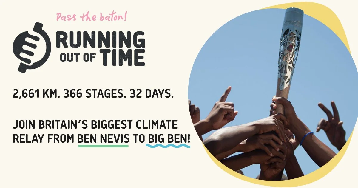 The Running Out of Time Relay is Britain’s biggest sporting celebration of climate action and nature. Taking place between June 10 and July 11th, thousands of runners, walkers, wheelers and cyclists will relay the baton 2661 km from Ben Nevis to Big Ben!